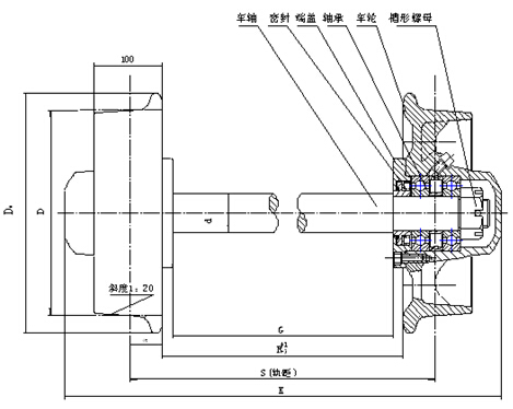 端蓋和密封架與輪殼和車軸之間采用骨架式橡膠密封圈和O型密封圈復合密封,適用于煤礦或其它類型的礦山井下或地面窄軌運輸車輛的輪對,主要由輪殼、端蓋、O型密封圈、骨架式橡膠密封圈、軸承、密封架、車軸和槽型螺母等部件組成。